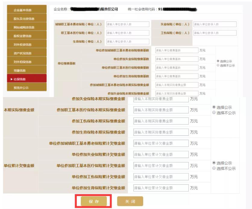 步骤13:企业社保信息,点击“社保信息”,本页面填写企业年报年度内社保信息填写,根据企业在社保部门登记和实际发生的年度信息如实填报。填写完成后点击“保存”。